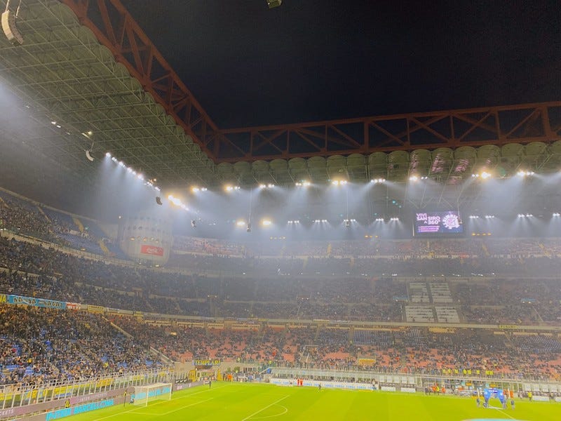 2019年秋にイタリア・ミラノ、インテルの本拠地サンシーロスタジアムで7万人のサポーターの1人として試合観戦したときの写真です。隣のシートでは80歳を超えたおじいちゃんが家族3代でインテルを応援していました。こちらは美しい方のサッカー文化ですよね。